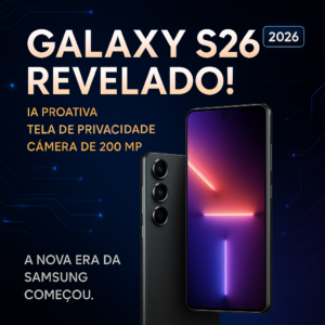 A Samsung apresentou oficialmente o Galaxy S26 no final de fevereiro de 2026, ampliando sua linha de smartphones premium da série S. O novo modelo chega com mudanças no visual, melhorias em inteligência artificial e um processador próprio mais eficiente.